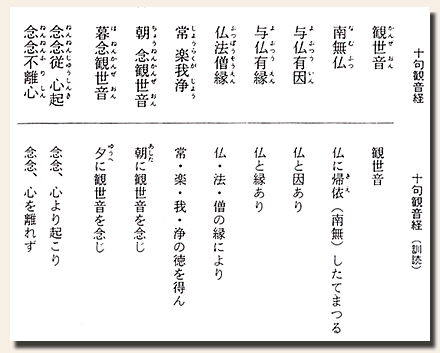 仏と仏の教え(法)と仏の教えを求めている人びと(僧伽(さんが)、略して僧)とのご縁によって、観音さまの常・楽・我・浄の四つの徳を私の身に授かりますように。
